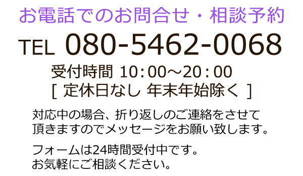 お気軽にお問い合・ご相談せください。080-5462-0068受付時間 10:00-20:00 [ 定休日なし年末年始を除く ]